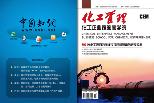 《化工管理》杂志是经国家广播电视总局批准,由中国石油和化学工业协会主管、中国化工企业管理协会主办的国家级化工管理类专业学术理论期刊。国内统一刊号:CN 11-3991/F,国际标准刊号:ISSN 1008-4800,邮发代号:82-181。主要栏目:工程施工、机械设备、石油化工、经济管理、技术创新、煤炭矿工、环境保护、管理创新、能源管理等。